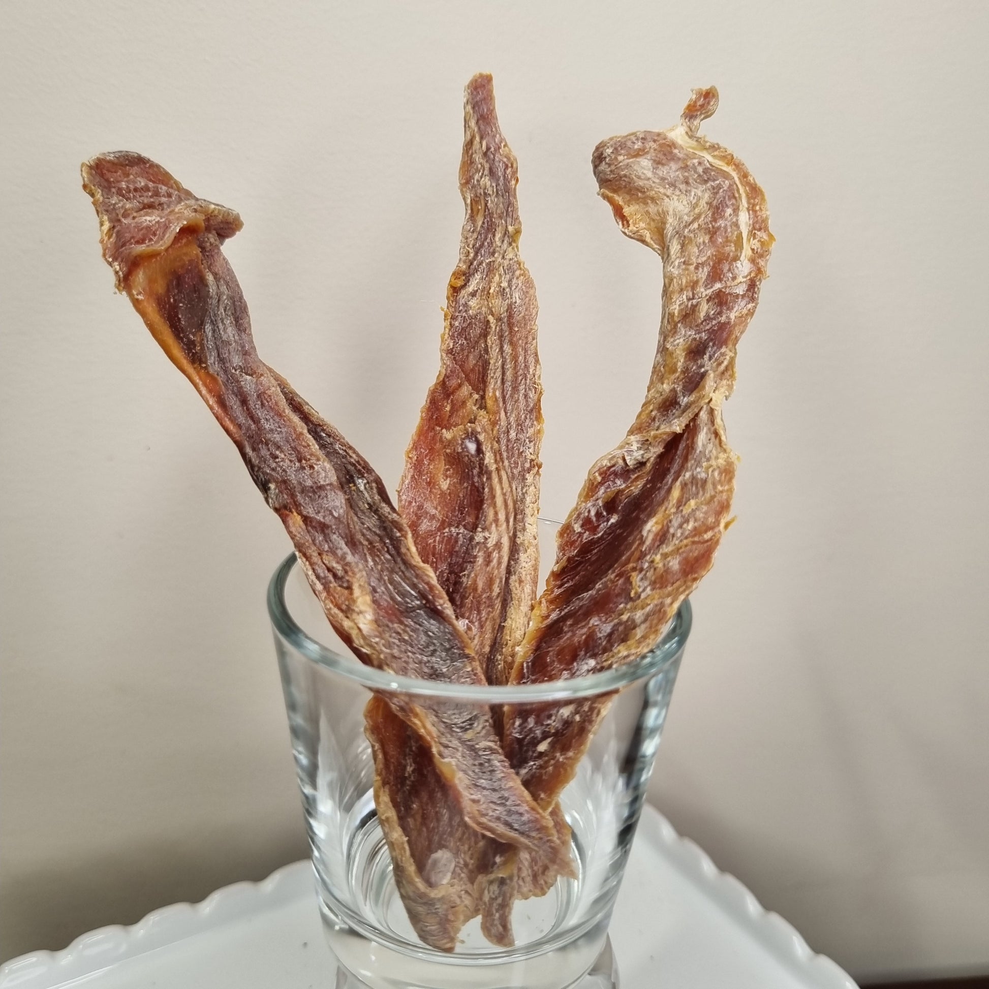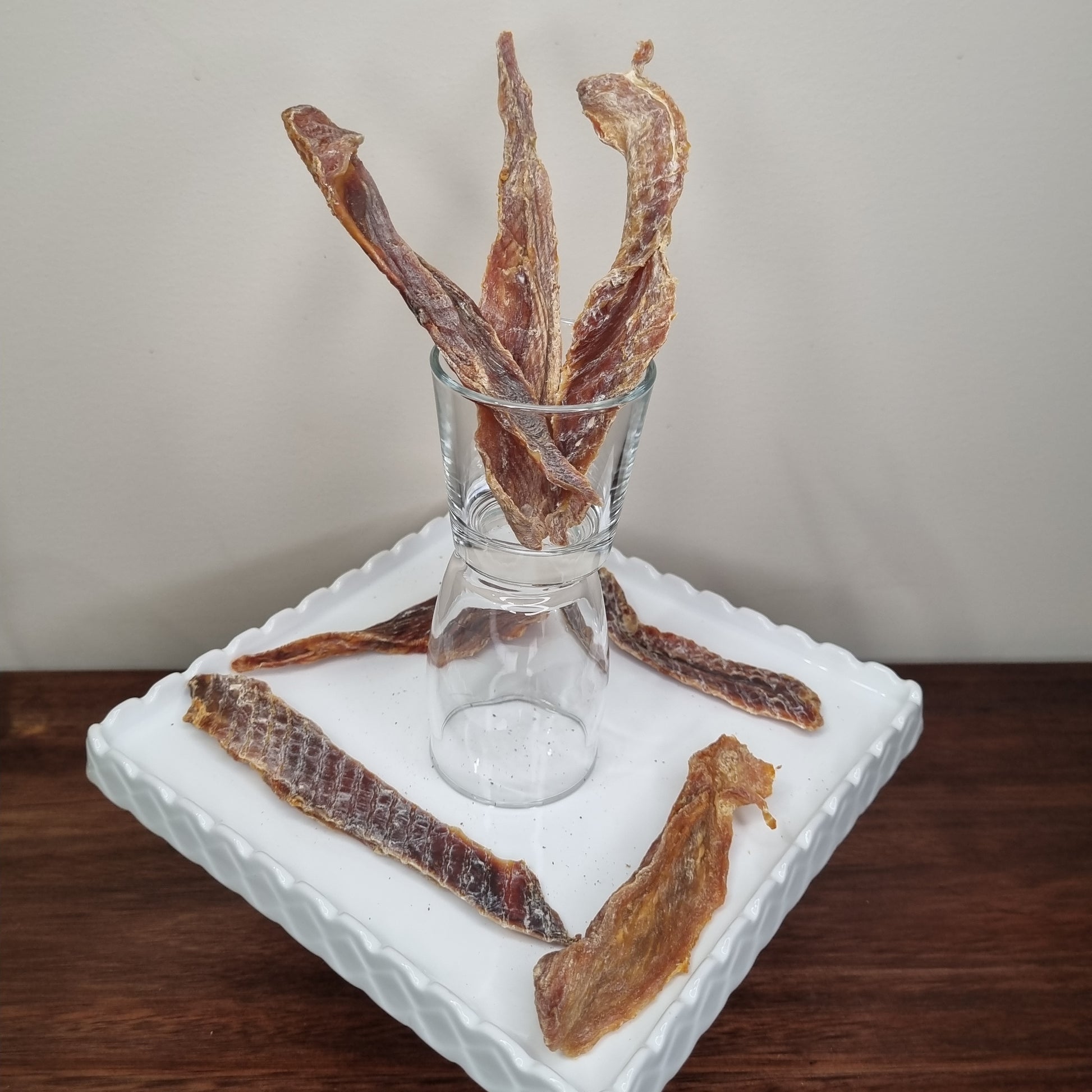 The Fish Jerky dog treats are natural product and cut up by hand so the sizes of piece vary but they are generally between 4 – 8cm long and 1cm thick. These treats are 100% Australian, using only Australian sharks. Containing no additives, so you can be sure your dog is not eating anything that will be harmful to its health.